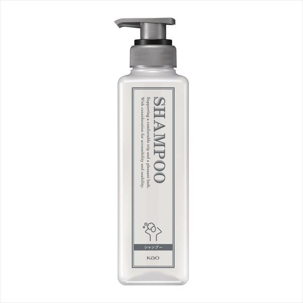 花王業務用アメニティ シャンプー専用の空容器。部屋置きにオススメの容量400mLタイプ。目を閉じても用途が識別できる触覚識別(凸状のきざみ)、直感的に伝わる識別ピクトグラム付き。外国の方のための多言語(英語・中国語・韓国語)表記対応。