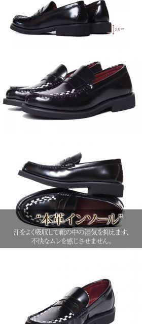 ローファー メンズ コインローファー 本革 エナメル 編込み 一層牛革 Uチップ ラウンドトゥ 艶 ブラック 大きいサイズ 27.5 cm 28