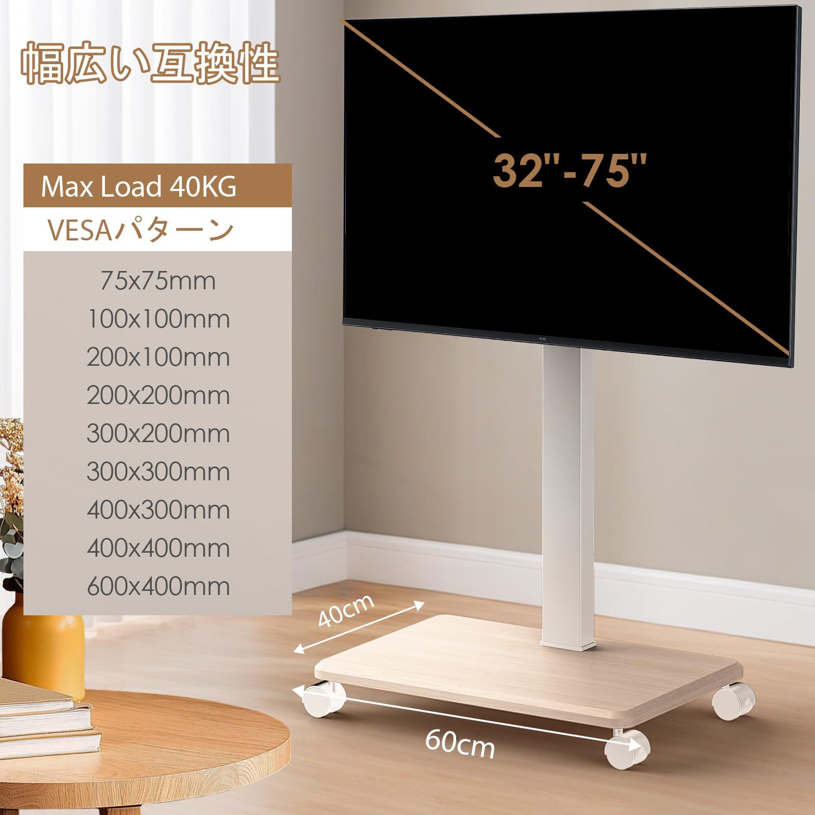 【対応テレビスタンド】:(1)対応サイズ:32~75インチ範囲以内。(2) 対応重量範囲:40kg以内。 (3) 対応VESA規格(背面に4つの正方形または長方形のネジ穴):VESA規格対応サイズは幅75~600mm、高さ75~400mm範囲以内であること。(4) 対応タイプ:サムスン、パナソニック、シャープ、ソニー、東芝、トムソン、LG、ハイセンス、TCLなどのブランドをカバーしていますが、それだけに限定されません。
