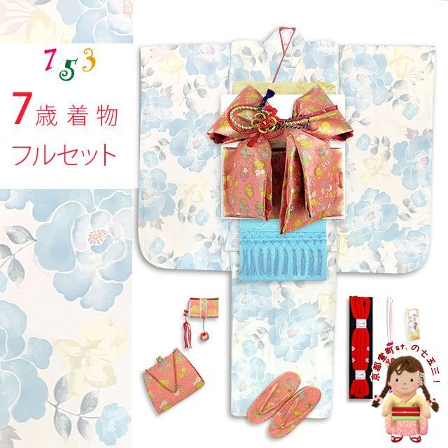 七五三 着物 女の子 セット 総柄の女の子用 子供着物 結び帯コーデセット 合繊 白系 薄青芍薬 T 7 K 2547 d 103 KAZ