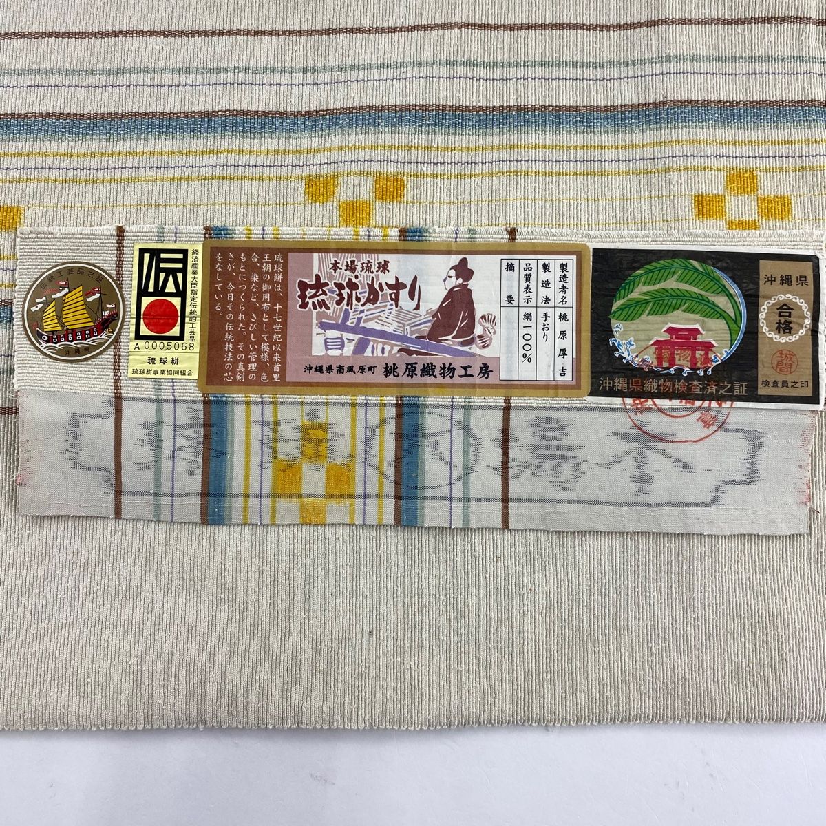 名古屋帯 琉球かすり 松葉仕立て 八寸名古屋帯 縞 幾何学模様 クリーム 正絹