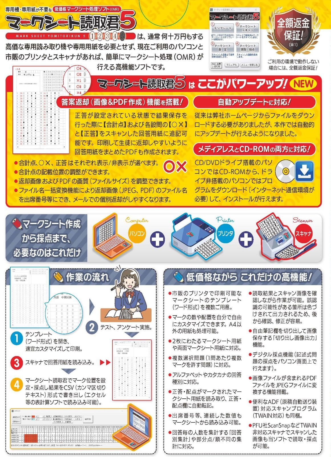 本作は、常何十万円もする高価な専用読み取り機や専用用紙を必要とせず、現在ご利用のパソコンと市販のプリンタとスキャナがあれば簡単にマークシート処理(OMR)が行える高機能ソフトです。今回のver5では以下の点がパワーアップしました。●答案返却(画像&PDF作成)機能を搭載!正答が設定されている状態で結果保存を行った際に、「合計点」および各設問の「○×」と「正答」をスキャンした回答用紙に追記可能です。回答用紙をまとめたPDFも作成されます。●自動アップデートに対応!●メディアレスとCD-ROMの両方に対応!