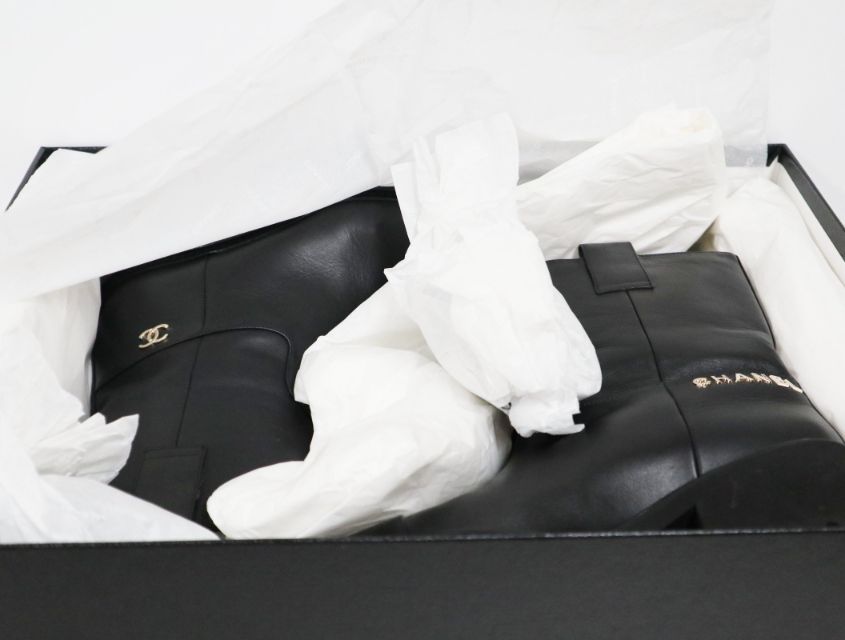 ワンポイントのロゴが目を引く、シンプルなシャネルのブーツ。