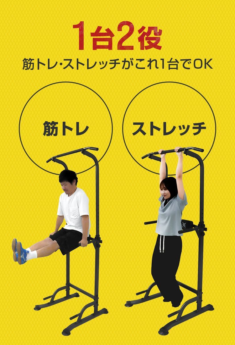 懸垂(チンニング)はもちろん、プッシュアップ、ディップス、レッグレイズなど、