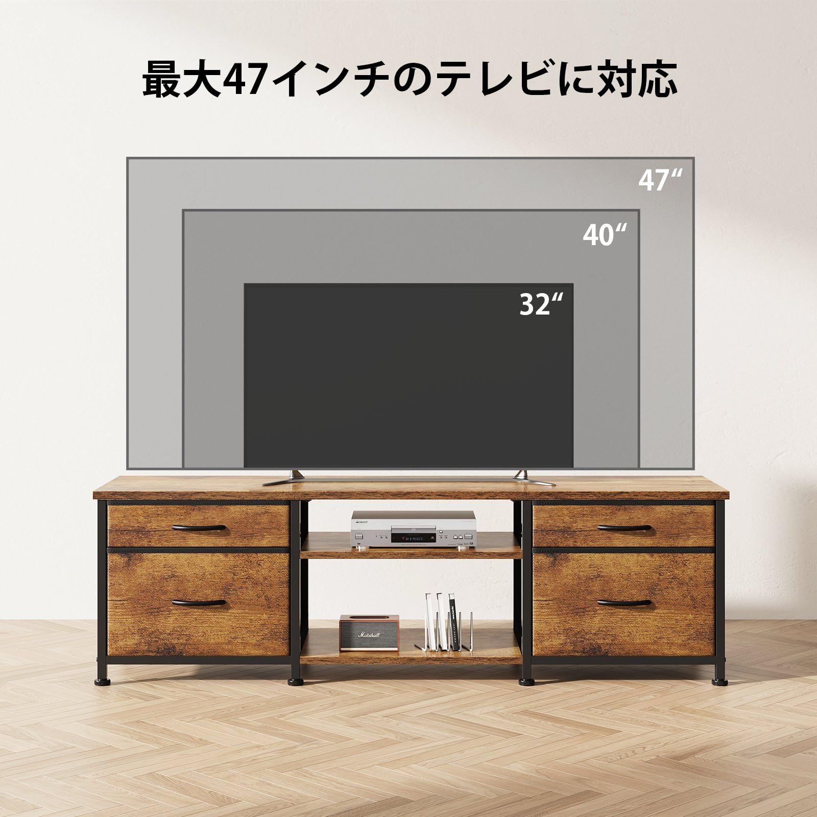 テレビ台 ローボード最適な収納システム:中央2段の高さ調節棚でBDレコーダー・サウンドバーを自由配置。奥行30cmを活かす4段フルアウト引き出し(リモコン/ゲームソフト専用)でtv standとして機能性抜群。