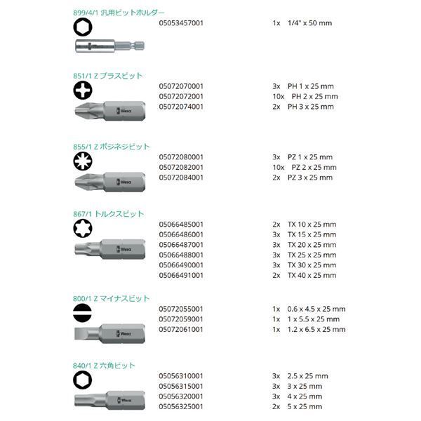 【付属品】ビットホルダー:1/4"x50mm、プラスビット:PH1(3個)・2(10個)・3(2個)×25mm、ポジネジビット:PZ1(3個)・2(10個)・3(2個)×25mm、トルクスビット:TX10(2個)・15(3個)・20(3個)・25(3個)・30(3個)・40(2個)×25mm、マイナスビット:0.6×4.5×25mm、1×5.5×25mm、1.2×6.5×25mm、六角ビット:2.5(3個)・3(3個)・4(3個)・5(2個)×25mm