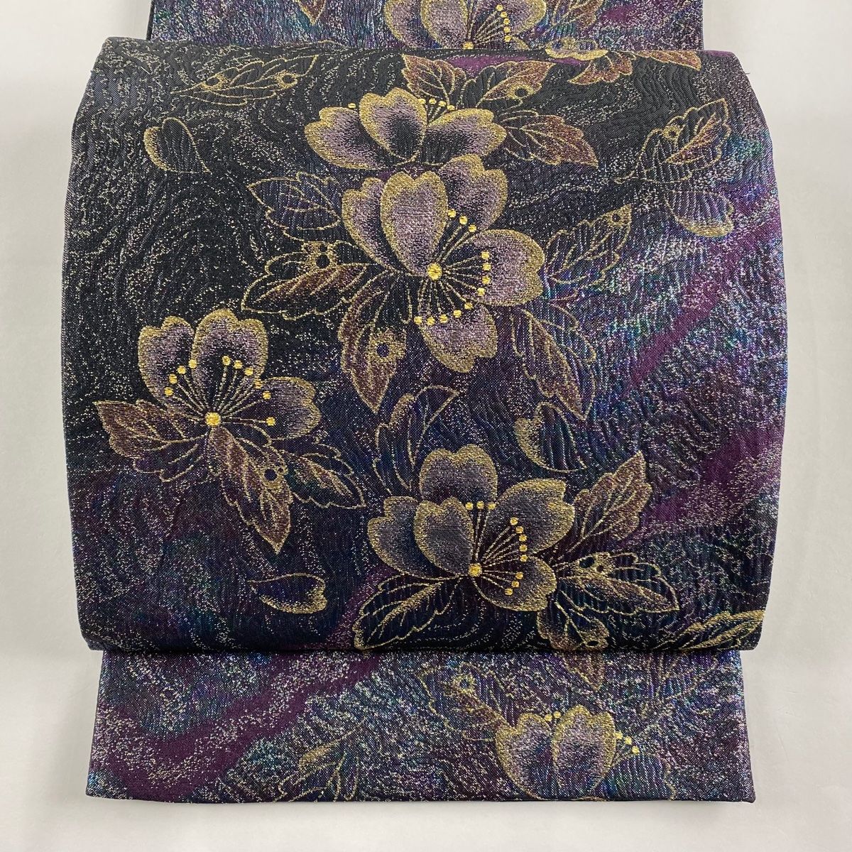 袋帯 秀品 草花 花びら 金糸 箔 黒 六通 正絹