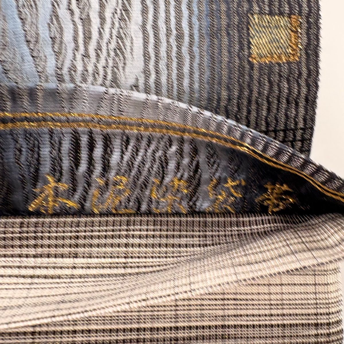 袋帯 本泥染 縞 幾何学模様 箔 金通し 紺色 六通 正絹