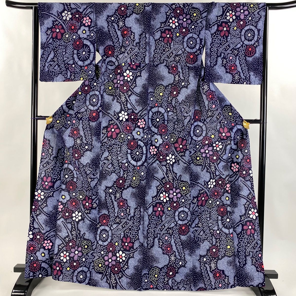 浴衣 身丈166 cm 裄丈63.5 S 絞り浴衣 源氏車 草花 紺色 綿