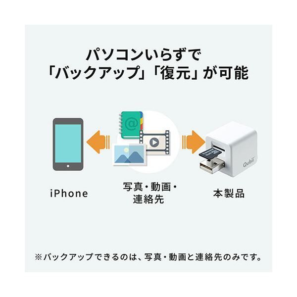●Apple純正ACアダプタ、本製品、iPhoneをケーブルで接続し、専用アプリ「Qubii」を使用することで、接続するたびに自動でデータをバックアップできます。
