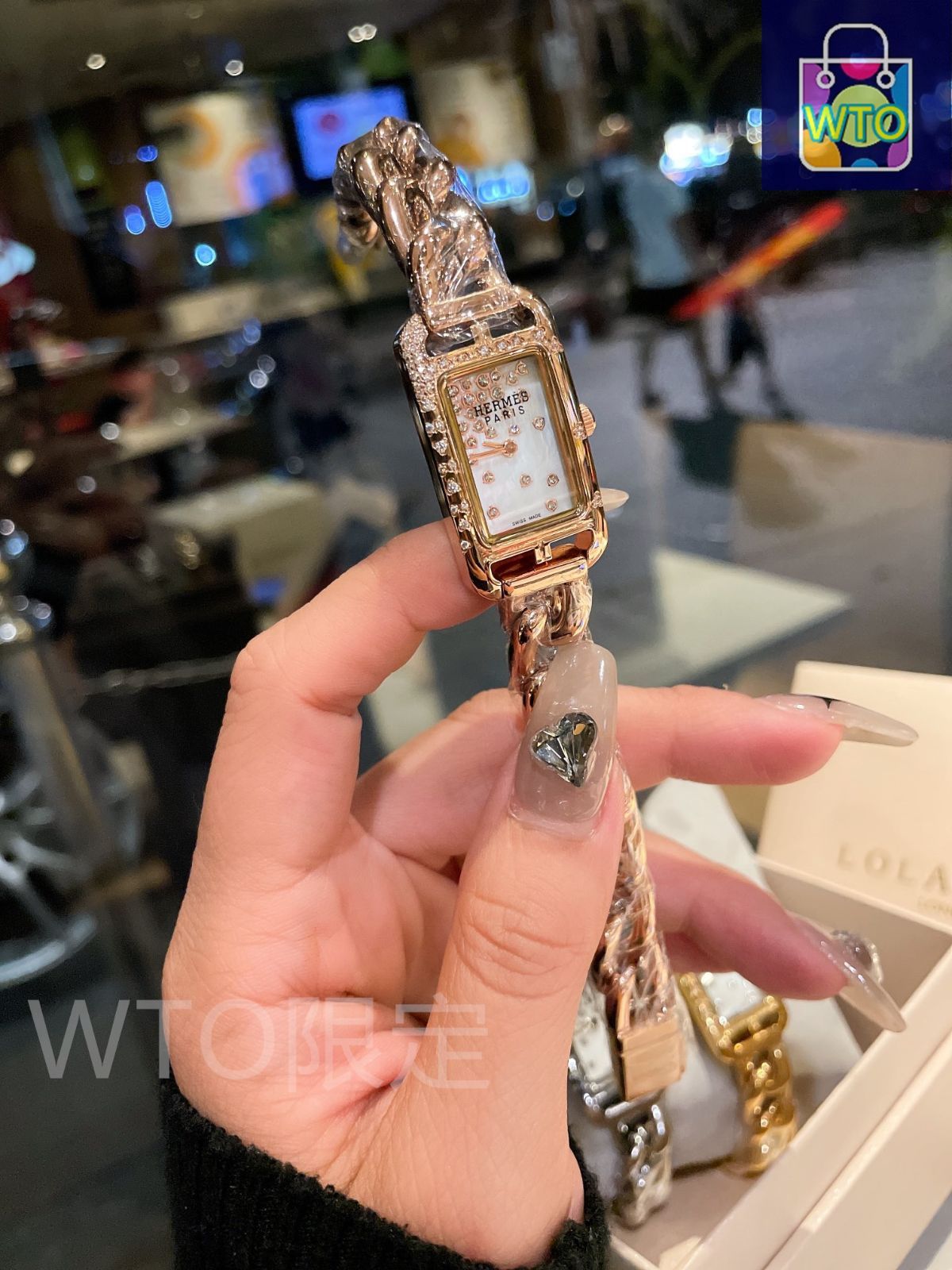ヘルメス (Herm?s) のナンタケット系列女款腕表は、クォーツ機芯を搭載しています。?面サイズは 17×23mm で、バンドは「自由に散らばったようなアンカーチェーン」デザインを採用。表?には 41 個のダイヤモンドが?嵌され、さらにダイヤモンドを?った貝殻製の文字盤を搭配することで、華やかさを演出しています。