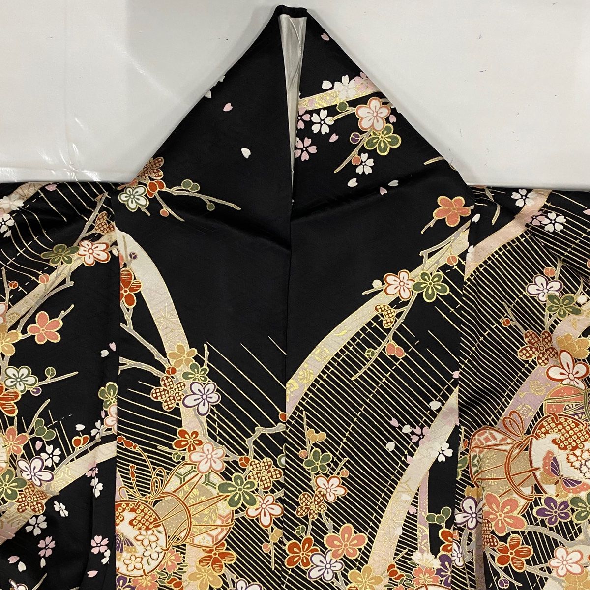 小紋 身丈160 cm 裄丈65 M 袷 やまと 鼓 枝梅 金彩 黒 正絹 秀品