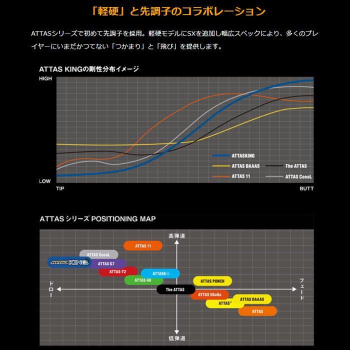 手元部から中間部にかけて四軸織物を採用。四軸織物の高い復元力を活かすことによってシャフト先端部が爆発的な加速を生み、今までにない