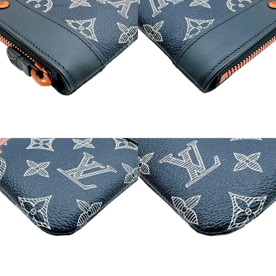 「アップサイドダウンLV」のロゴプリントと金具のカラーをレッドでまとめた特徴的なデザインで使い勝手も良い薄型ポーチです。