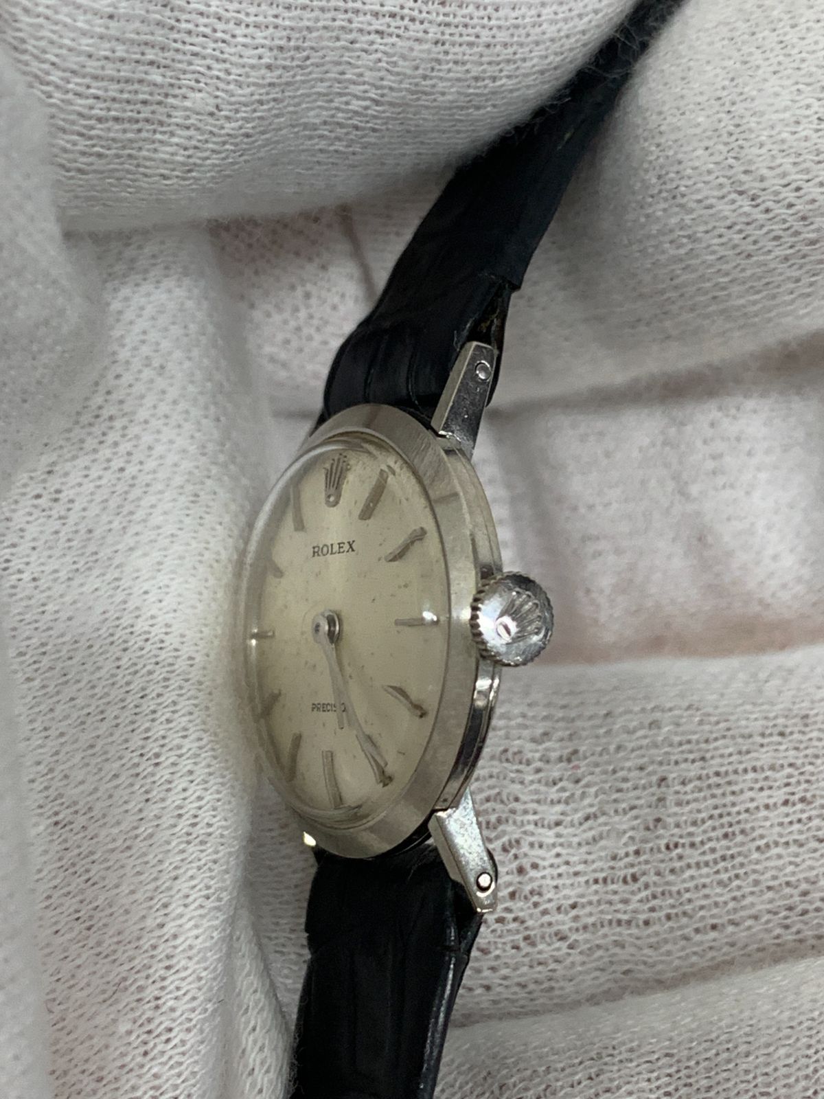 ROLEX☆PRECISION☆ヴィンテージ☆18K金無垢☆手巻き時計☆Cal.1400搭載☆稼働品です。裏蓋内側には「MONTRES ROLEX S.A. GENEVA」「18K 0.750」ホールマーク刻印、ムーブメントには「ROLEX GENEVA SWISS 17 RUBIS」の刻印が残る本物の金無垢ケース&純正ムーブメントです。シリアル・ケース番号も一致。さらに2014年5月、伊勢丹時計売場にて分解掃除(オーバーホール)、ゼンマイ・パッキン交換など正規修理履歴あり。伊勢丹修理カード・修理伝票付属で安心感抜群です。風防・文字盤には経年変化が見られますが、動作確認済み。ベルト・尾錠は交換されています。小ぶりでクラシカルなデザインはコレクターにも人気が高い希少モデル。長期保管を考慮し現状品としてのお渡し。18K無垢ヴィンテージロレックスをコレクションにぜひどうぞ!