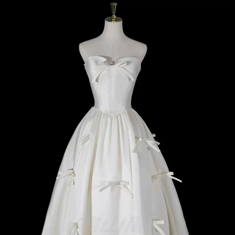 【新品未使用】2025新作 ウェディングドレス ウエディングドレス 二次会 結婚式 前撮り ブライダル ロングドレス 花嫁 プリンセスドレス チューブトップ リボン サテン オフショルダー 可愛い