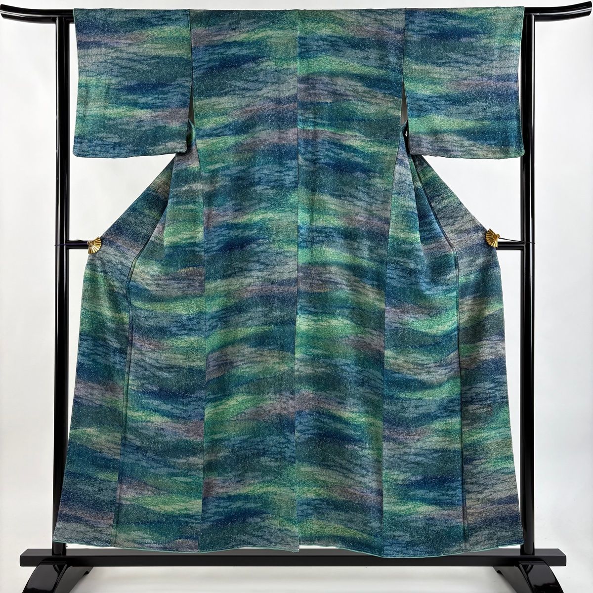 小紋 身丈154 cm 裄丈61 S 袷 落款 霞 幾何学模様 金彩 青緑 正絹 秀品