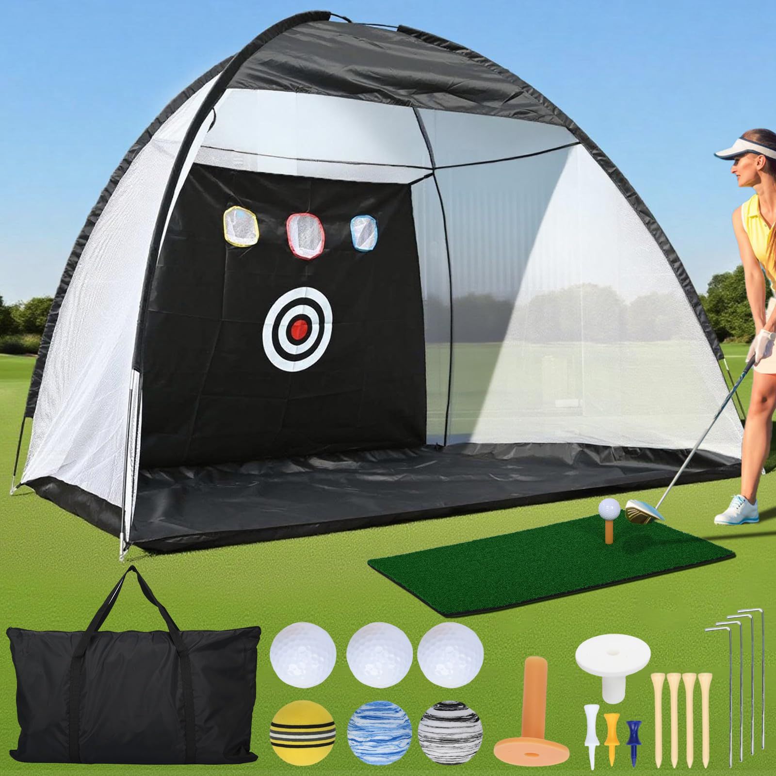 【屋内・屋外どこでも手軽に練習】このオールインワンゴルフ打撃トレーニングネットは、ゴルフ練習ネット、芝生マット、ボール6個、ティー7個、収納バッグがセット。リビングや裏庭など、ご自宅の好きな場所で簡単に設置でき、天候に左右されずにスイング練習やスキル向上が可能。ゴルフコースに行く時間がなくても、日常的に自宅で練習できる、ゴルフ愛好家や父の日ギフトに最適な実用的な練習道具です。