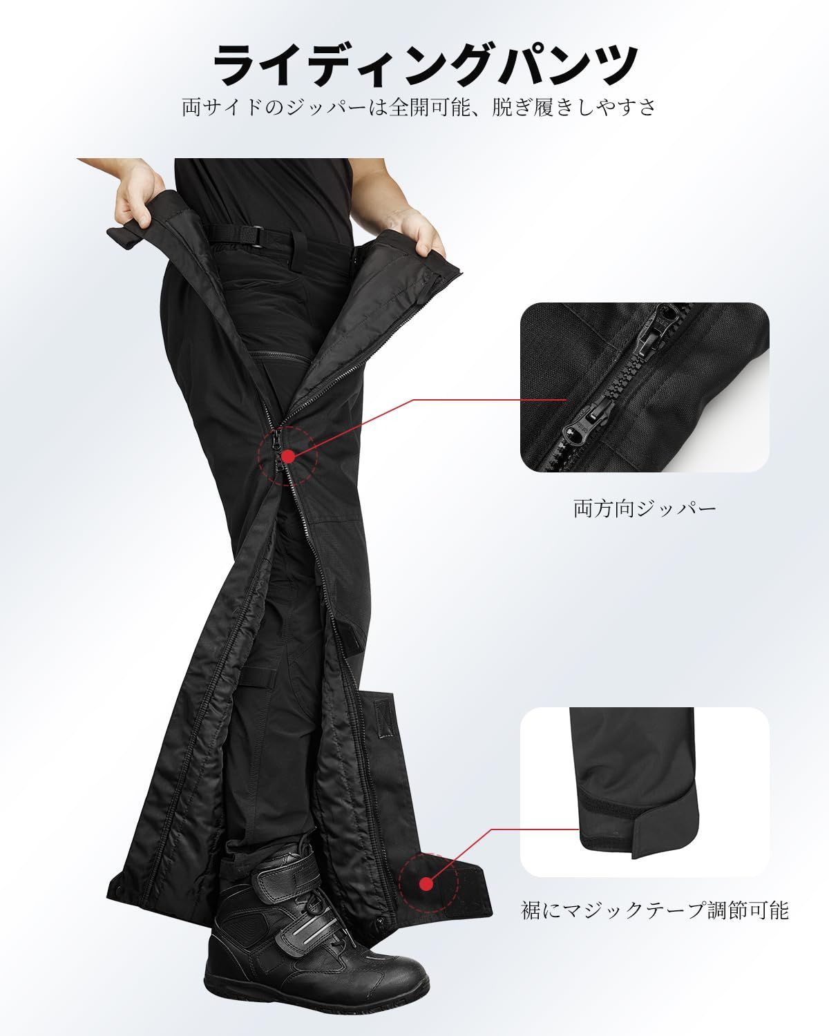 【ジッパーで着脱が便利】:バイク用ウインターパンツの両サイドにABSジッパーは全開可能、脱着しやすいです。