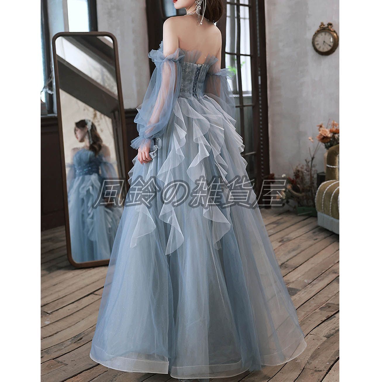 ♥ カラードレス プリンセスライン 青 ブルー パフスリーブ 長袖上品 ロングドレス ウェディングドレス 結婚式 二次会 花嫁 前撮り 演奏会 発表会 ステージ衣装 シフォン ふわふわ