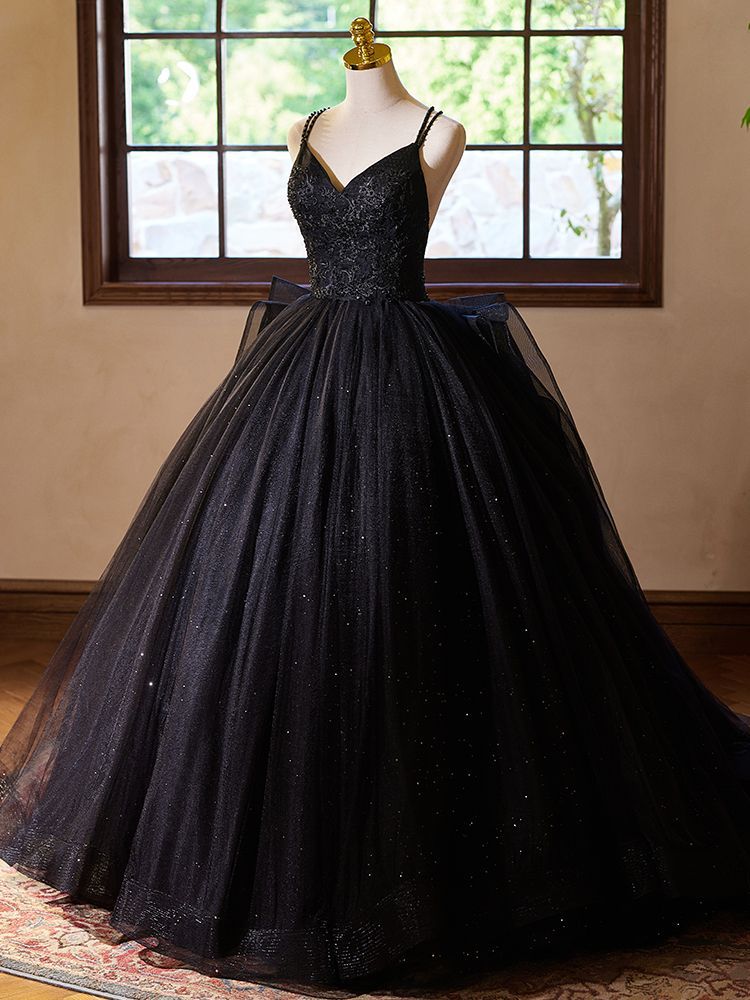 黒色のキャミソールデザインと蓬蓬スカートが特徴の高級感あふれるロングドレスでございます。結婚式や披露宴、撮影、成人式、パーティーなどさまざまな華やかな場面に最適で、上品で優雅な印象を演出いたします。