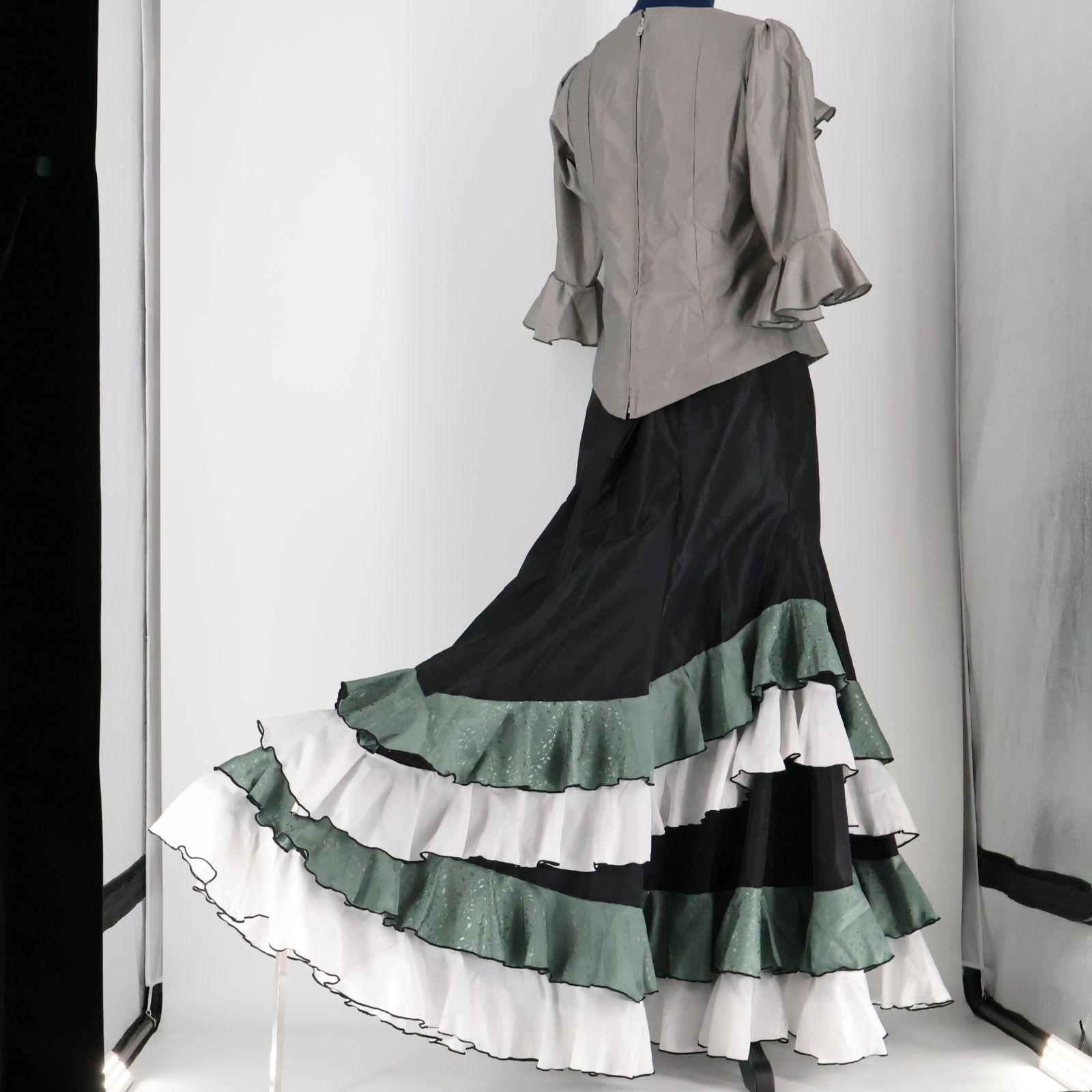 フラメンコ衣装 グレー アトリエ貴美恵 上下セット ツーピース ファルダ トップス ボランテ フリル ブラック 灰色 黒 光沢 軽い 薄い ボリューム グリーン ホワイト 緑 白 華やか 豪華 セットアップ 長袖 袖有り 無地
