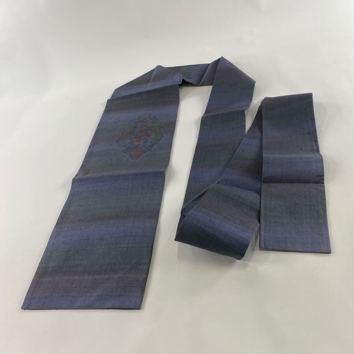 名古屋帯 秀品 紬地 草花 蘇州刺繍 青紫 正絹