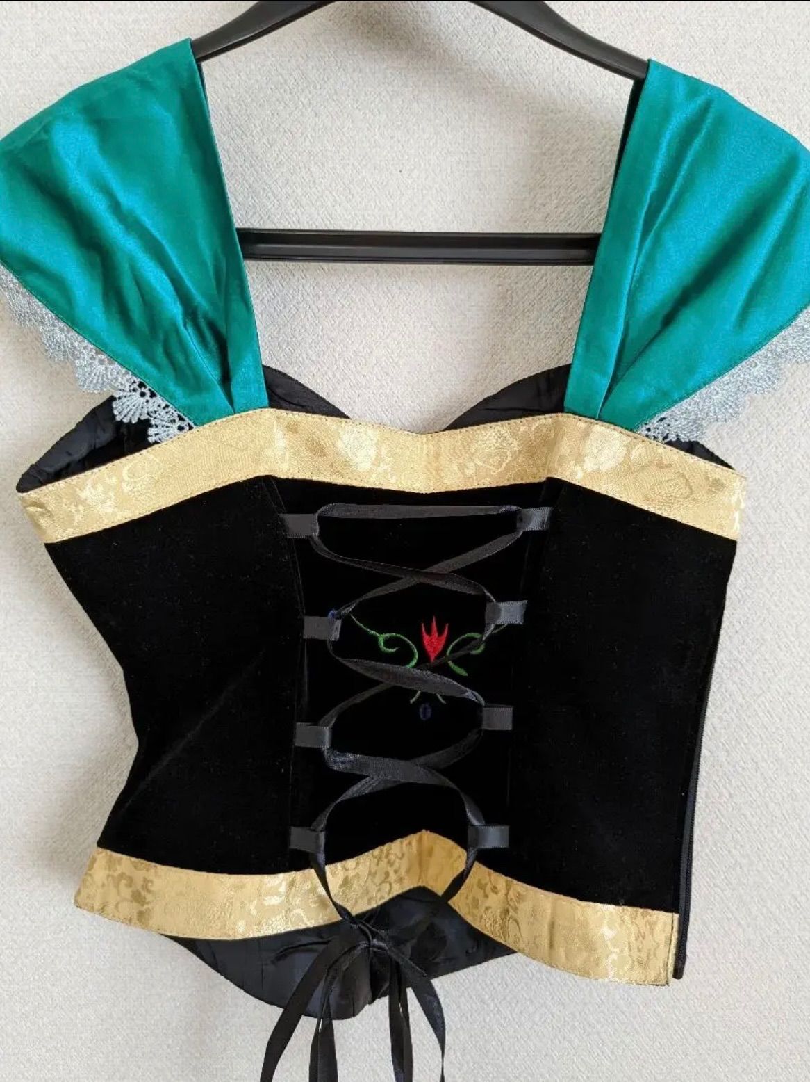 トップスの生地はしっかりとしたベロア生地で後ろは編み上げリボンになっており、調整可能です!スカートの模様も全部刺繍ですし、布量も多かったりと、とても高級感があります。Dハロ(ディズニーハロウィン)の仮装の日に着ていっても遜色ありません。着脱も簡単にできるようしっかり設計されています。ネックレスはアンティーク風の古したデザインで、リボンはベロア生地です。