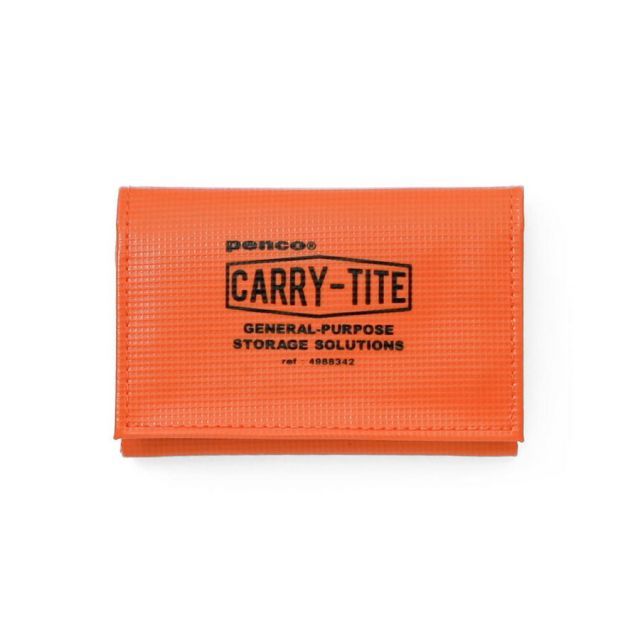 テントやトラックの幌などに使われる丈夫な素材であるターポリンを使用したキャリータイトケース。三つ折りして小銭入れやカードケースになり、二つ折りでやや小ぶりなポーチとしてもお使いいただけます。【検索ハッシュタグ】#ハイタイド#カードケース#カード入れ#キャリータイトケース#ペンコ#オレンジ#橙