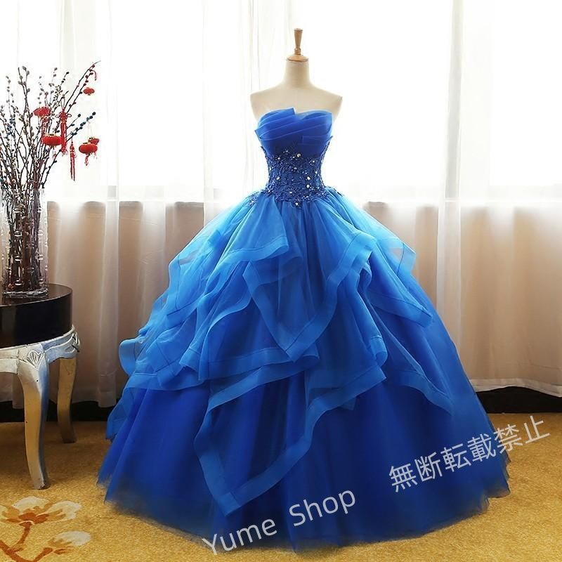 ♥ カラードレス 演奏会 ロングドレス ウェディングカラードレス 二次会 プリンセスライン 結婚式 ステージ衣装 パーティー 青 コンサート 大きいサイズ nhdw 121