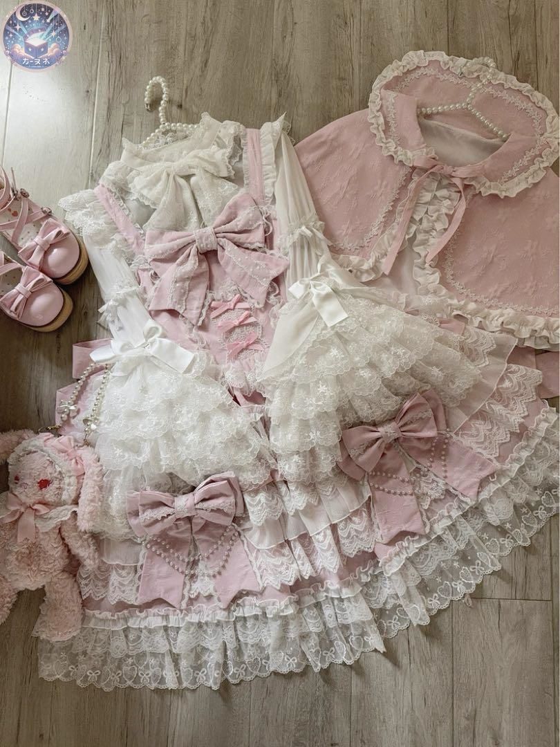 十字心結 ロリィタドレス3点セット ジャンパースカート ケープ ピンク 甘ロリ