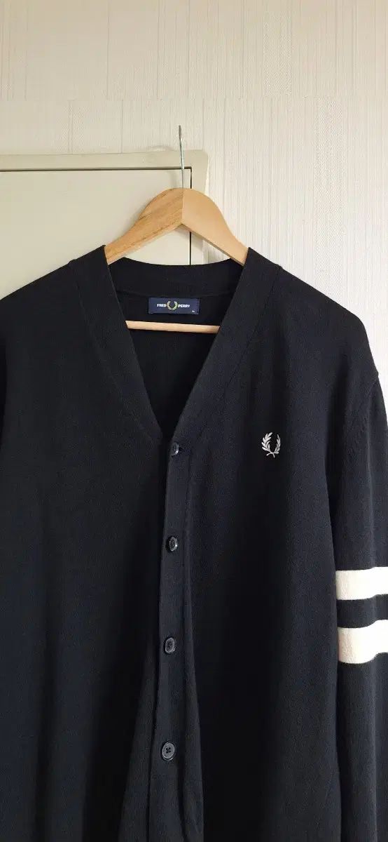 これはXLサイズの男性用フレッドペリーカーディガンです。ブラックカラーは袖の白いラインがアクセントになっています。