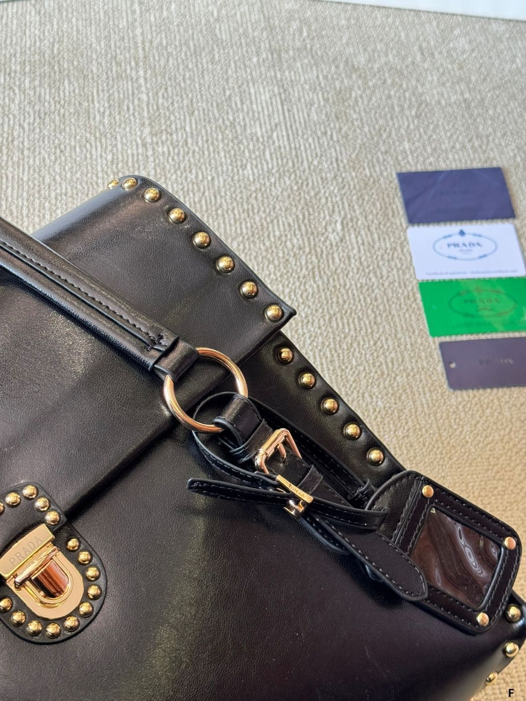 PRADAのレトロなショルダーバッグ。深みのあるチョコレートカラーとヴィンテージ風のブロンズ金具が特徴です。丸型リベットのディテールもおしゃれな一品。サイズは縦33cm × 横35cmで、日常使いに最適です。