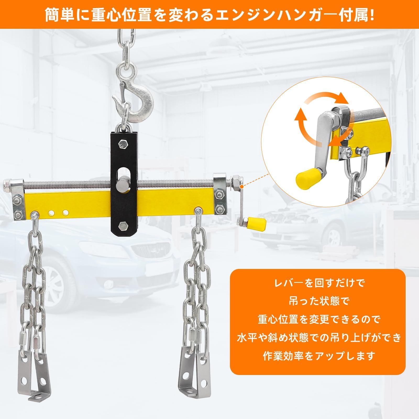 【幅広いシーンで活躍】重い荷物だけでなく/自動車も引き上げられます.家庭用にも工場用にも最適です.