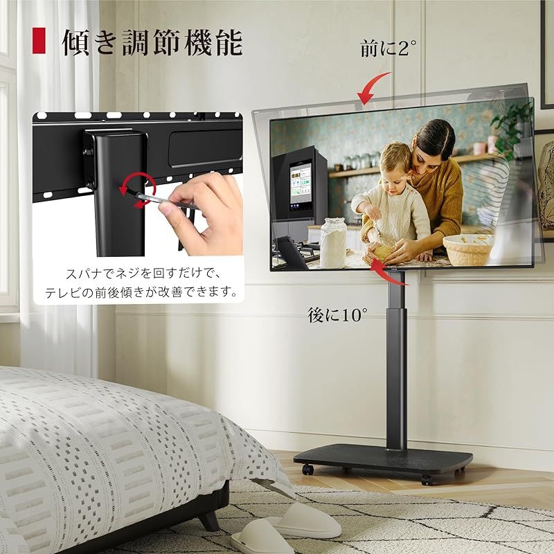 【キャスター付き移動式】ブレーキ付きな360°回転キャスターが付きます。部屋のどこにいてもテレビを楽しめます。滑り止めゴム足とキャスターは互換できます。支柱背面にケーブル管理クリップが付き、乱れた配線を隠し、周りをすっきりと整理整頓します。