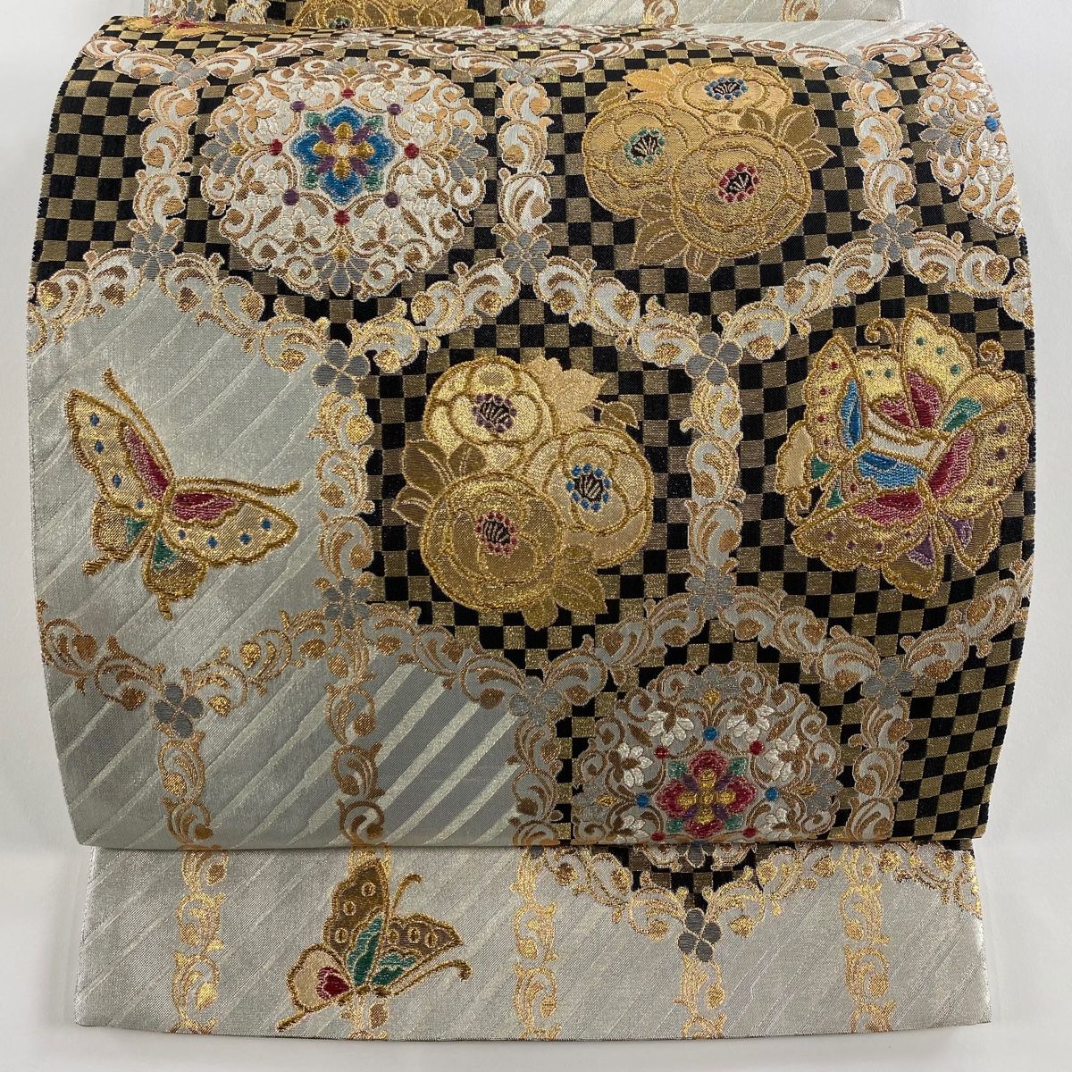 袋帯 秀品 花蝶 華文 金糸 箔 銀色 六通 正絹