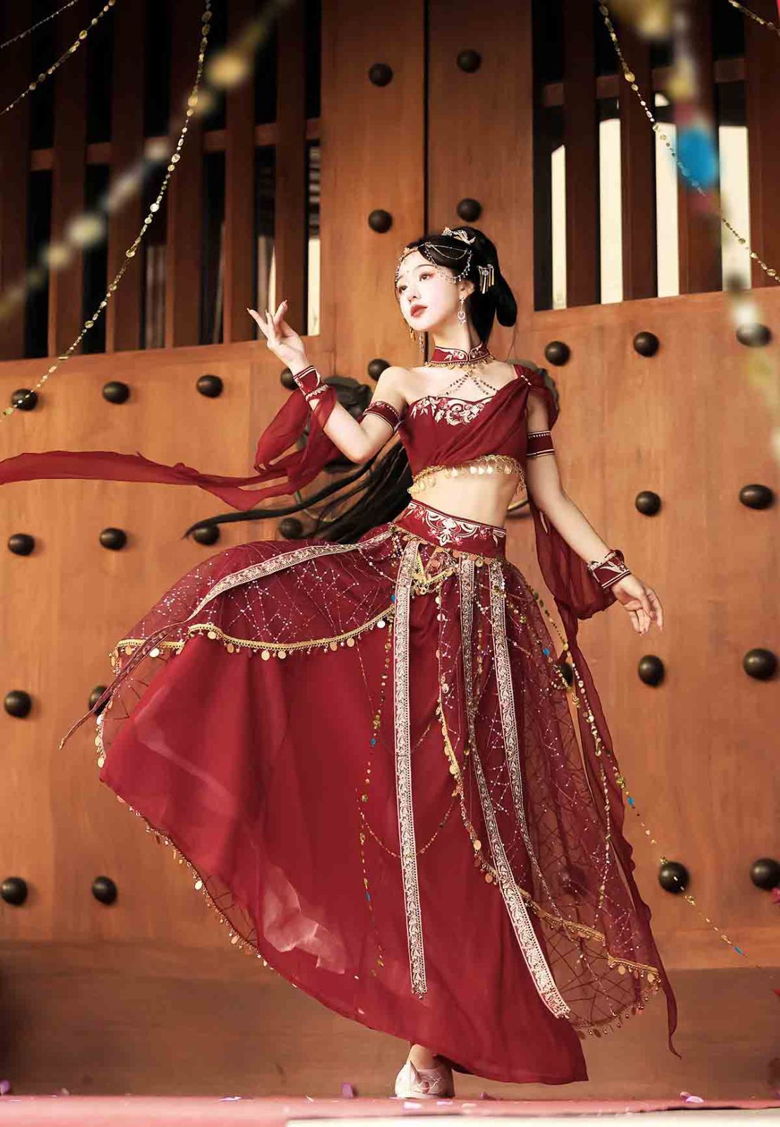 漢服 女 敦煌風 西域風 衣装4点セット 古風 衣装 チャイナ風 中華風 コスプレ 撮影用 舞台衣装 エスニック風 ダンス 演出用 フェミニン ベリーダンス アラビアン ワインレッド
