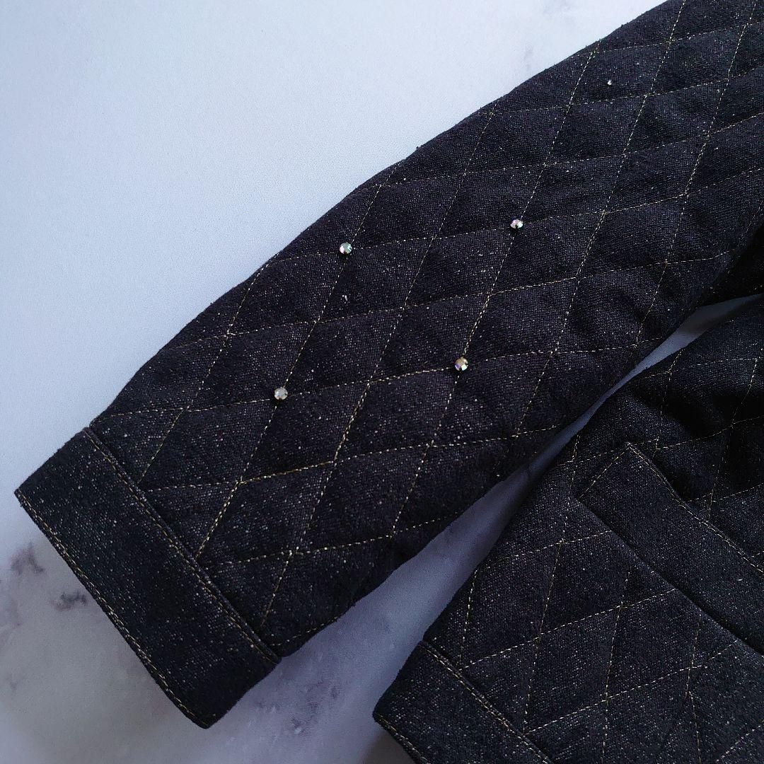 LEONARD レオナール ラインストーン ビジュー キルティング シルク ノーカラージャケット 中綿 サイズM 9 長袖 黒 ブラック デニム アウター コート レディース