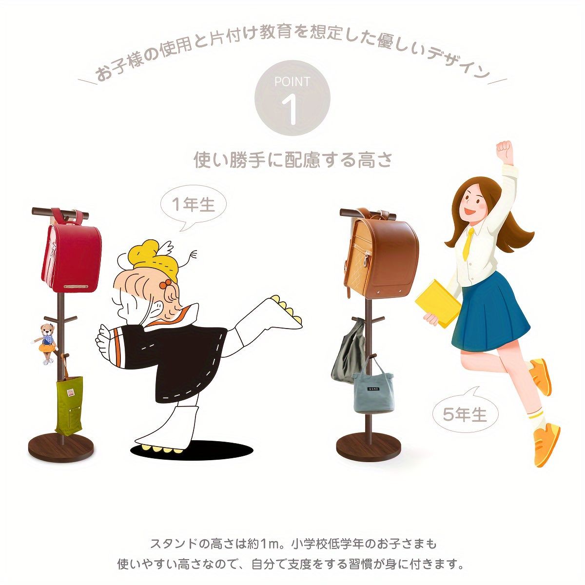 2人分のランドセルやリュックが収納でき、ハンガーラックとしても使える多機能デザイン。