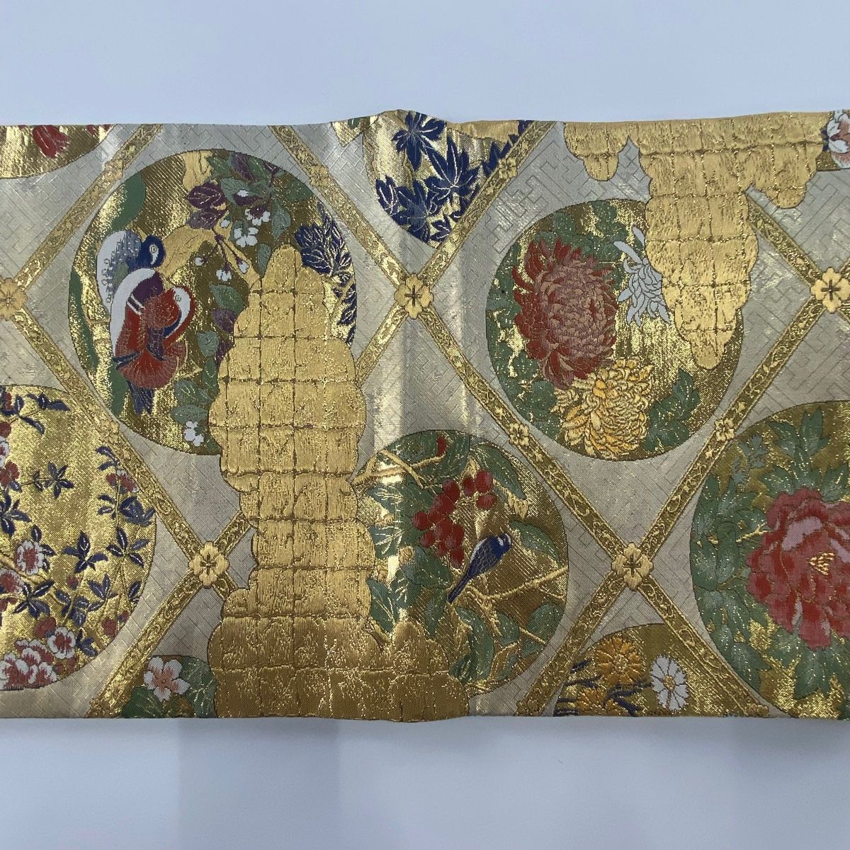 丸帯 秀品 落款 本金箔 花鳥図絵 箔 金糸 金色 お太鼓柄 正絹