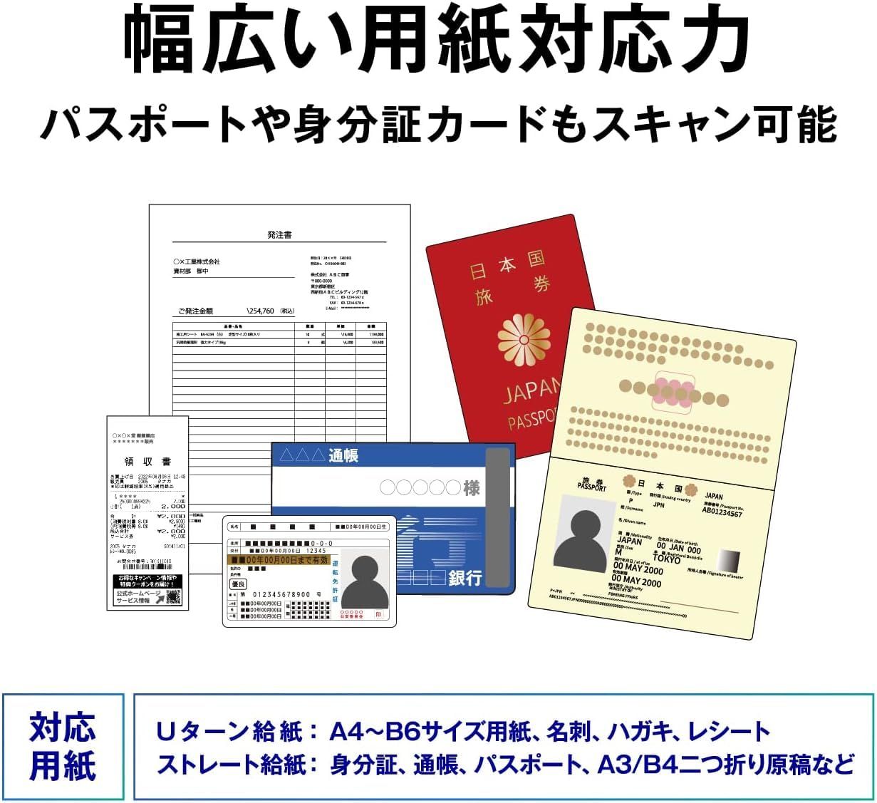 本体をストレート姿勢にすれば、身分証などのカード、A3/B4二つ折り原稿、通帳などの冊子、パスポートがスキャン可能。