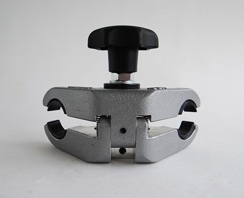 ・エルボ型継手とポリエチレン管を融着する際、対象材を固定するために用いる工具。