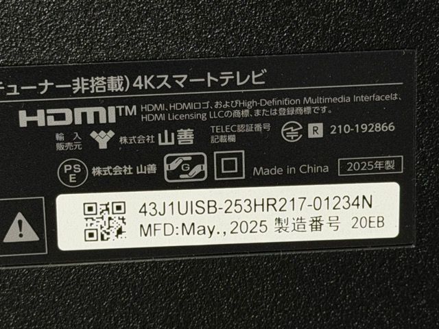 43 V型 チューナーレステレビ YAMAZEN QRK-43 TL 4 K ネット動画対応 製 山善 Kスマートテレビ 106019 23117