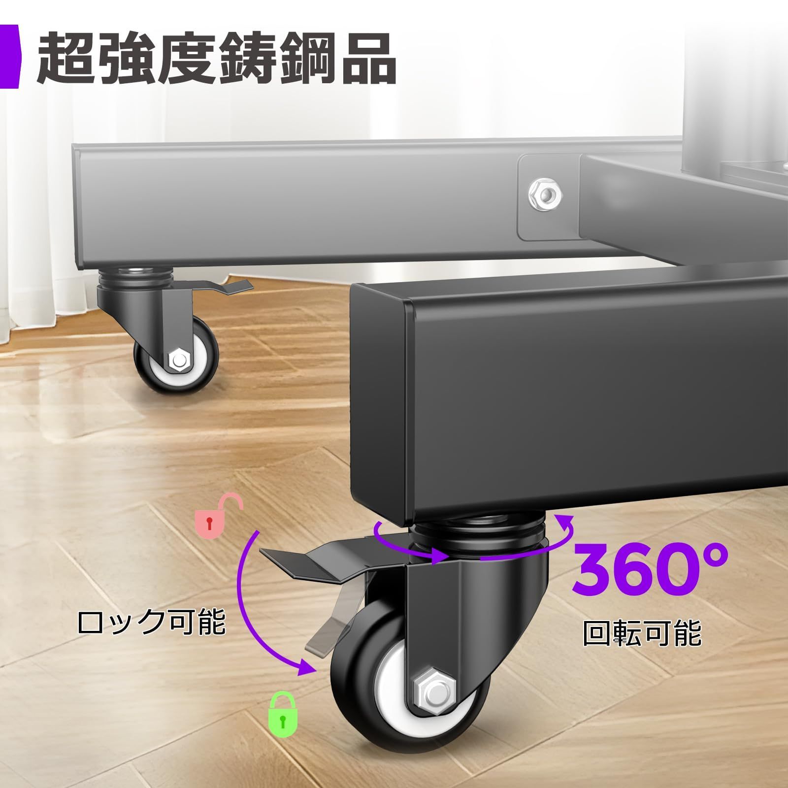 【移動便利】移動式壁寄せテレビスタンドはブレーキ付きの頑丈な360°キャスターが4つあり,移動時静音性が高くて、部屋の掃除しやすいです。取る付ける方法は商品付きの説明書をご覧ください。