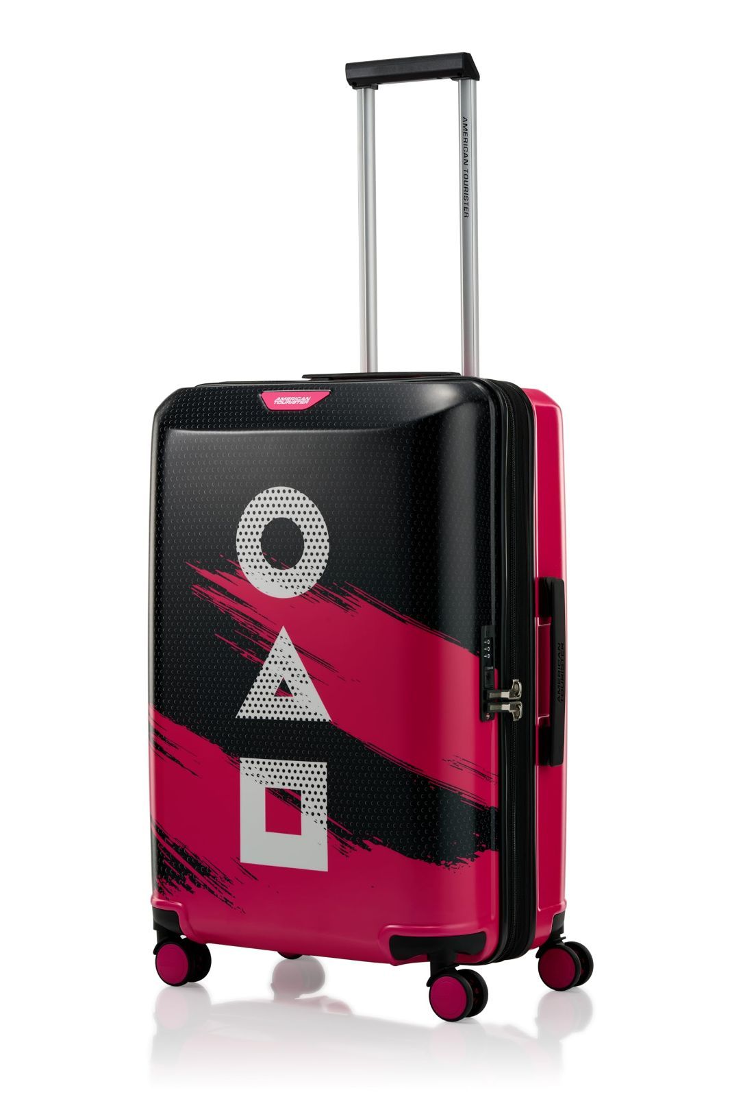 [アメリカンツーリスター] スーツケース キャリーケース イカゲーム スクイッドゲーム SQUID GAME スピナー 67 Mサイズ 中型 4-6泊 拡張機能付き エキスパンダブル ピンクガードのラゲッジタグ付き 〇△□柄 TSAロック 68(75) L 67cm 3.9kg ブラック×メキシカンピンク