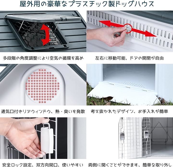 pempet 犬小屋 ペットハウス プラスチック ドッグハウス 屋内 屋外 小型犬 中型犬 大型犬 天窓付き ドア付き 防雨 換気 軽量 全天候型 オールシーズン グレー L