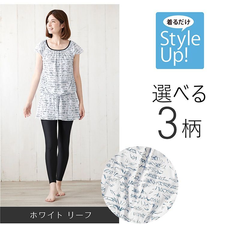 体型カバー水着 重ね着風 かんたん着脱 UVカット ブラウジングタイプB ホワイトリーフ柄 上下セット 水陸両用 大きいサイズ ママ 30代 40代 50代 セパレート タンキニ かわいい リゾート水着 女性用