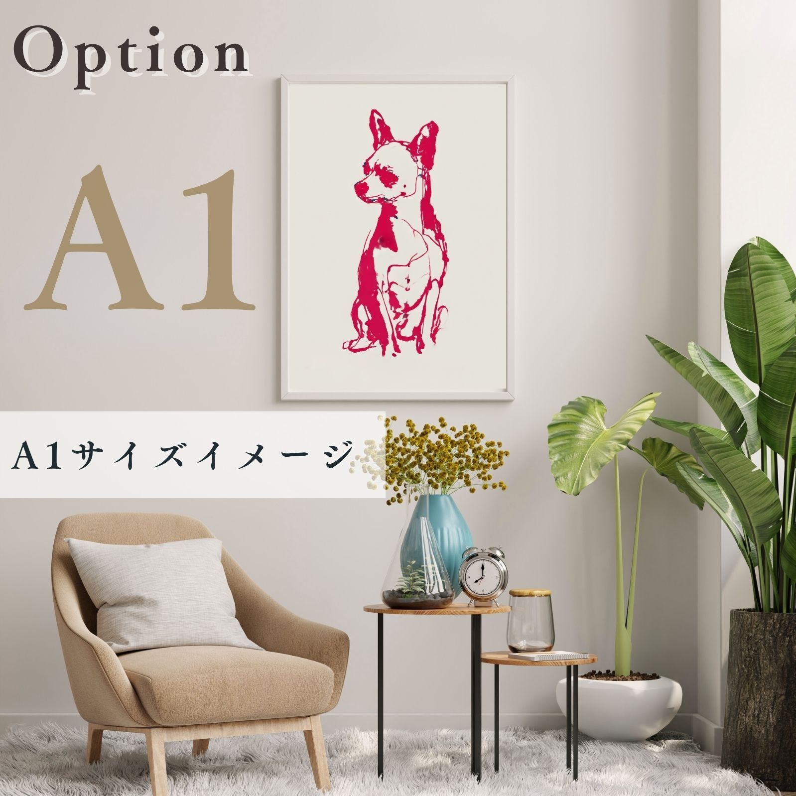 小さすぎず大きすぎない、A2ポスターサイズ(420 × 594mm)の高画質・高品質のドッグアートプリント絵画です。